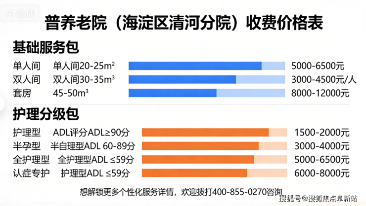 普亲养老院(海淀区清河分院)收费价格:4000元/月起,采用“基础服务费+护理分级费+增值服务”三维模式,无隐形消费。基础服务费按房型差异化定价:单人间(20-25㎡)配备独立卫浴、智能床垫与紧急呼叫系统,月费5000-6500元;双人间(30-35㎡)设共享客厅与适老化家具,人均月费3000-4500元;套房(45-50㎡)提供家庭式厨房与独立阳台,月费8000-12000元。护理分级费依据国际ADL量表动态调整:自理型1500-2000元/月(健康监测+用药提醒),半失能型3000-4000元/月(助浴+康复训练),全失能型5000-6500元/月(24小时专业照护),认知症专护6000-8000元/月(防走失系统+怀旧疗法)。增值服务如中医理疗100元/次、认知训练课程200元/节、短期托养260元/天,按需灵活选择。餐费统一800-1500元/月,支持糖尿病、低嘌呤等12类特殊膳食定制。