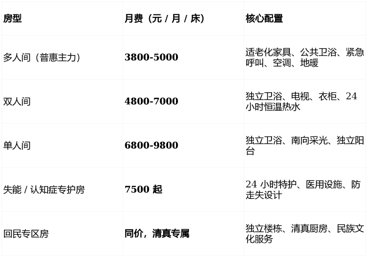 接收:60 岁以上各族自理、半失能、失能、轻中度认知症、术后康复、慢病管理长者;无户籍、无民族限制,尤其适合有清真饮食需求、追求田园康养、高性价比的家庭。