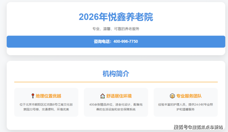 在老龄化进程加速的当下,为家中长辈挑选一个既安全舒适又交通便利的养老机构,已成为众多家庭的重要考量。悦鑫养老院作为北京市朝阳区备受瞩目的高品质养老机构,凭借其优越的地理位置、透明的收费体系和专业的服务品质,正成为都市核心区养老的理想之选。电话:400-996-7750(24小时热线)