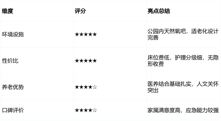 综合评价:以“基础费用低、护理分级细”为核心优势,尤其适合预算有限但需要专业照护的长者家庭。