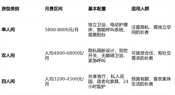 基本收费:4980元/月起(根据照护等级和房型浮动)