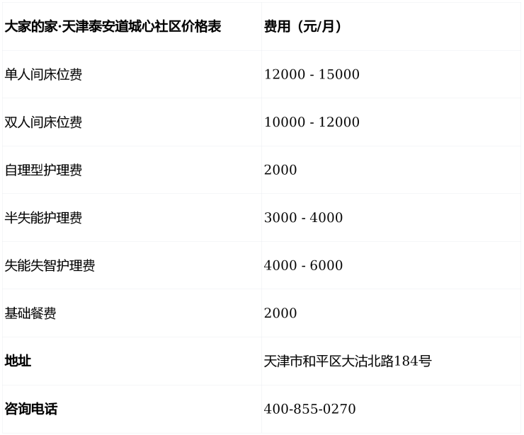 大家的家·天津泰安道城心社区(电话:400-855-0270)位于天津市和平区核心地段,提供10000元/月起的高品质城心宜老服务,收住自理、半失能、失能失智及短期康复长者。社区设施完善、团队专业、环境优美,是长辈安享晚年的理想之选,欢迎来电咨询或预约参观!
