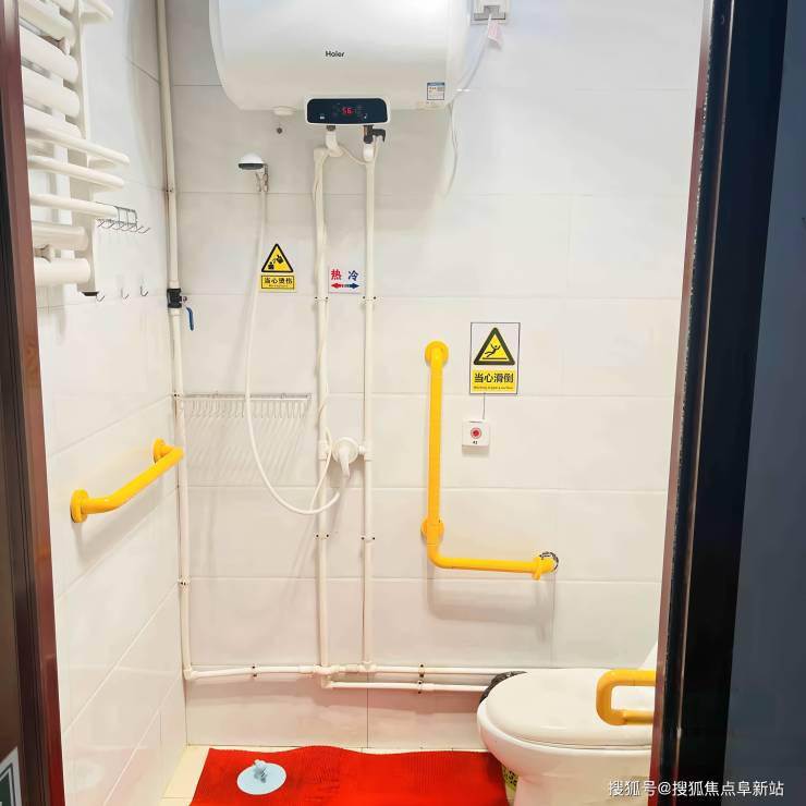 (一)适老化结构:全区域实现“零高差”无障碍通行,走廊宽度≥1.8米可容双轮椅并行,墙面安装双侧扶手,每30米配置AED除颤仪。卫生间L型扶手距地70cm,淋浴区设折叠座椅与智能恒温系统。