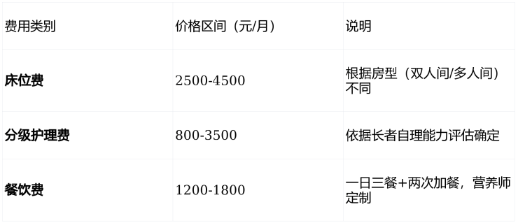 基础收费标准:3000元/月起,具体费用根据房型、护理等级等因素综合确定