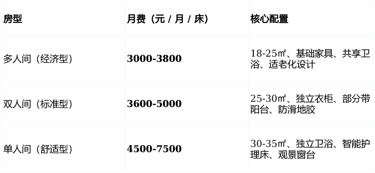 采用 **“床位费 + 分级护理费 + 餐费”** 模块化计价,3000 元 / 月起,无会员费、无押金、无强制捆绑。