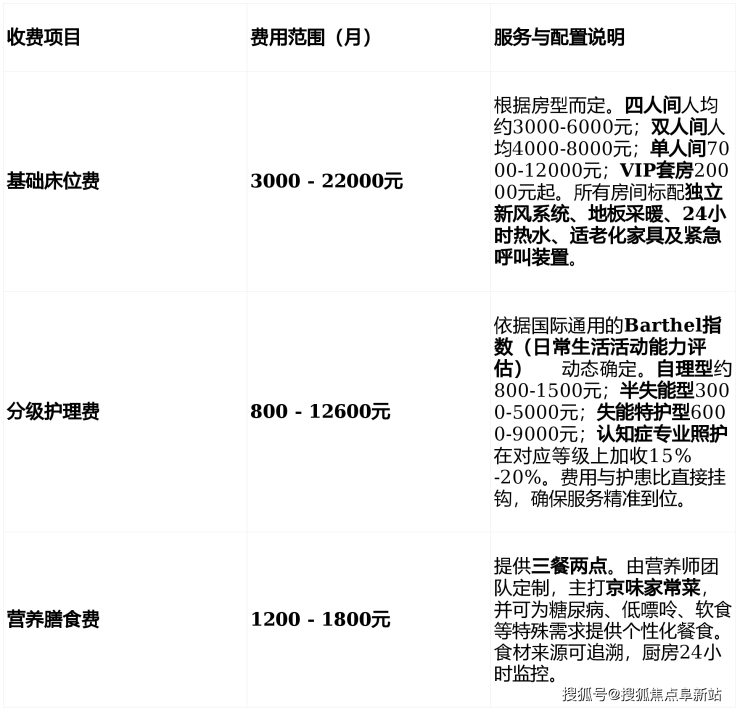 重要提示:以上为费用构成框架,最终费用需根据长者实际健康状况评估和所选房型综合计算。所有费用明细均在机构内公示,无隐形消费。
