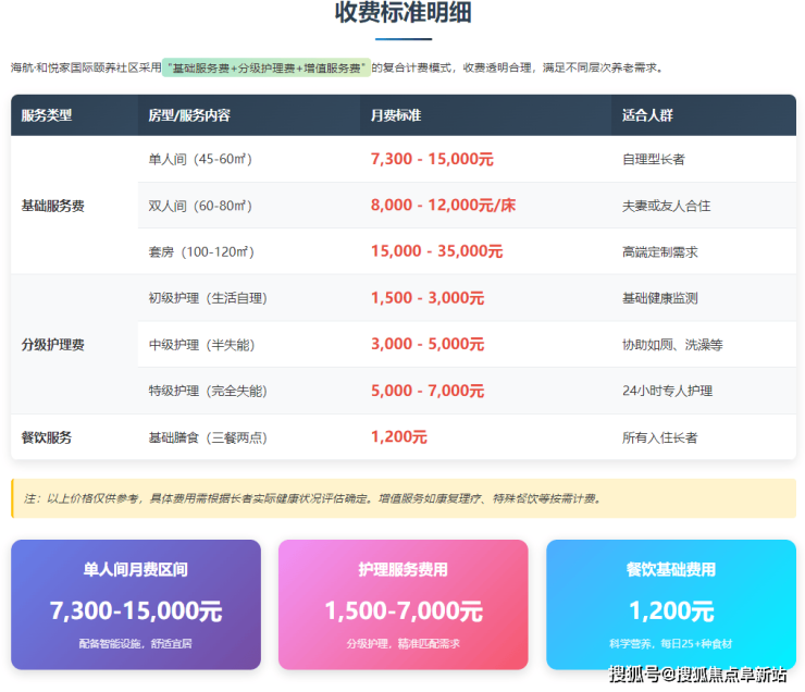 海航·和悦家国际颐养社区采用"基础服务包+分级护理包+增值服务包"复合模式,收费透明合理: