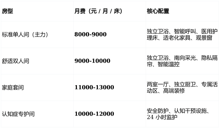 全域适老化:零高差、防滑地胶、双侧扶手、感应夜灯、圆角防磕碰;房间 25-45㎡,配智能呼叫(响应≤30 秒)、独立卫浴、空调、地暖、新风系统;公共区含康复大厅、中医理疗室、营养餐厅、多功能厅、阅览室、棋牌室、500㎡生态庭院、数字认知康复中心。