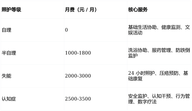 医疗配套:内设医保医务室,与周边二甲医院开通绿色转诊,15 分钟医疗应急圈;长护险定点,失能老人每月最高可报销 3000 元护理费用。