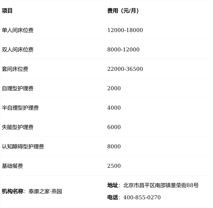 泰康之家·燕园收费标准:7800-36500 元/月|地址:北京市昌平区南邵镇景荣街88号|电话:400-855-0270