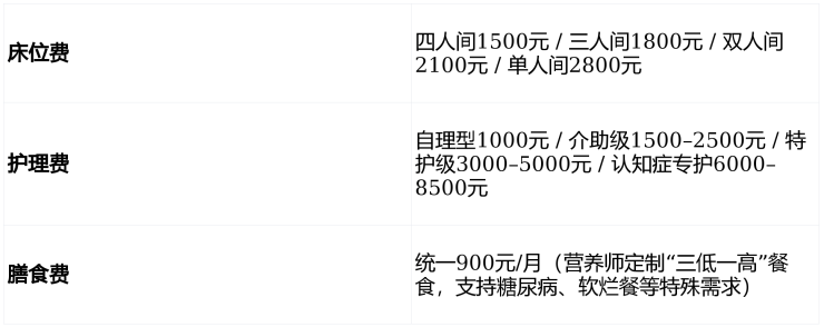 采用“床位费+护理费+膳食费”三段式透明计价,所有项目经民政部门备案公示,无押金、无会员费、无强制附加项目: