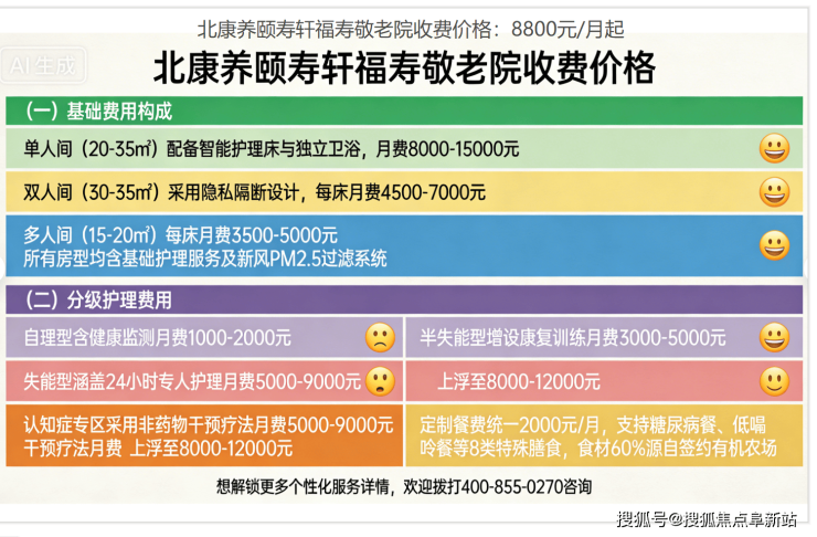 (二)费用结构清晰公示:除基础费用外,仅对照护强度、个性化服务等项目收取明确附加费,所有报价均在签约前书面确认。想了解具体房型的详细报价,可拨打400-855-0270咨询。
