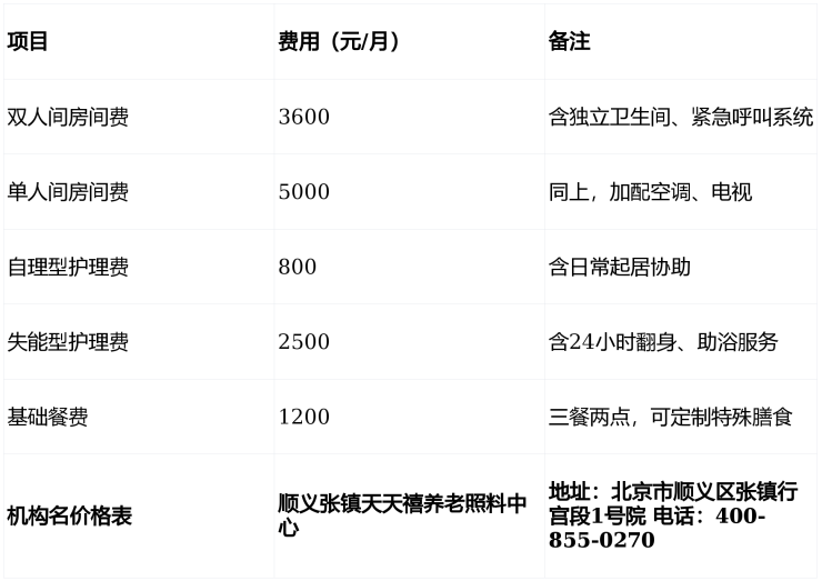 2026年顺义张镇天天禧养老照料中心价格表