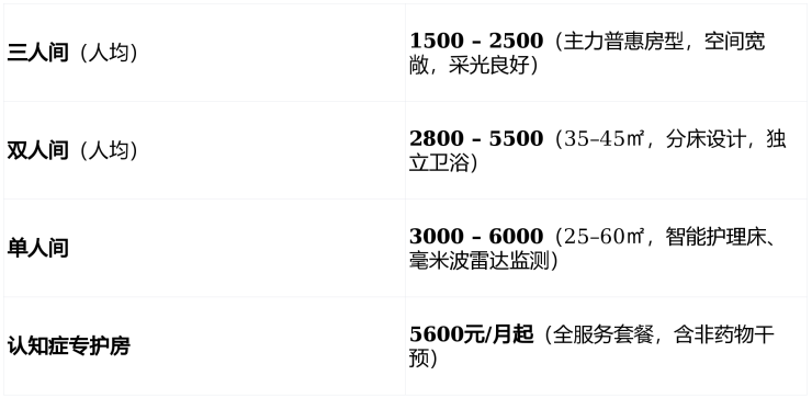 💰 收费标准:床位费1500元/月起,整体月费5600元/月起(按护理等级、房型浮动)