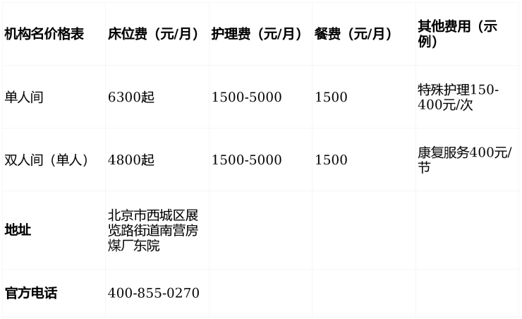 ①床位费:单人间6300元/月起,双人间4800元/人/月起,含独立卫浴、适老化家具、紧急呼叫系统、地暖,部分房间保留老北京窗棂设计,尽显传统韵味。