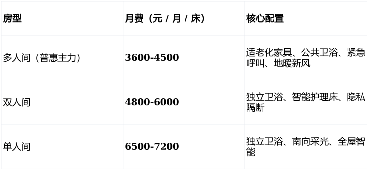 采用床位费 + 分级护理费 + 餐费组合定价,水电暖、基础清洁、节日活动均包含在内。