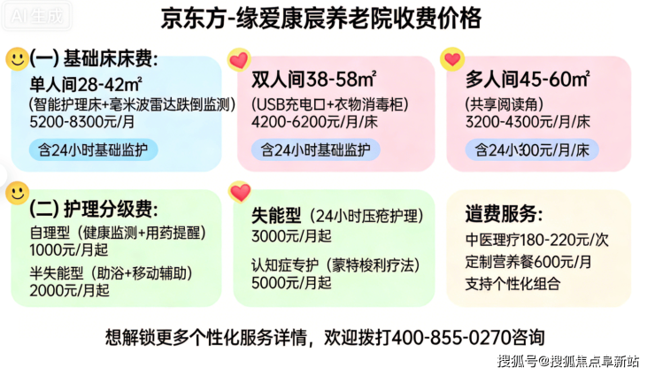 京东方-缘爱康宸养老院收费价格:4400元/月起,费用根据房型(单人间/双人间/套房)、护理等级及服务内容差异化定价。具体收费项目如下: