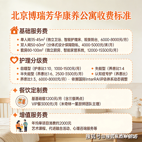 公寓采用“基础服务费+护理分级费+餐饮定制费+增值服务费”四级定价模式,月均费用为6000元起,具体如下: