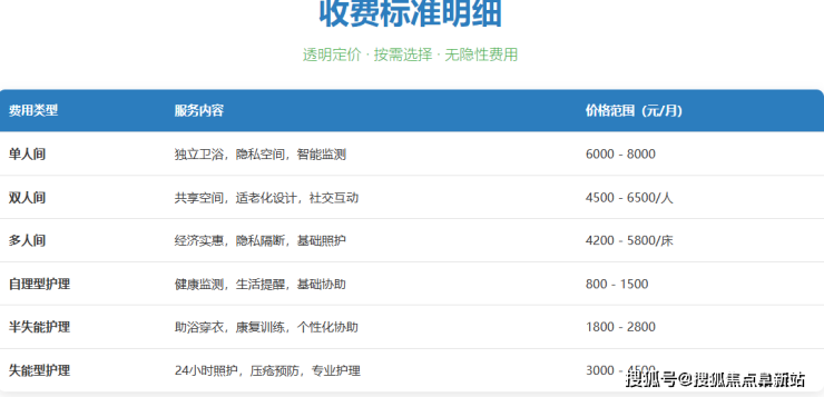 北京香河怡康养护中心采用"基础住宿费+分级护理费+个性化增值服务费"的复合收费模式,所有费用公开透明,无任何隐性消费。整体月均费用区间为4500元/月起,具体构成如下: