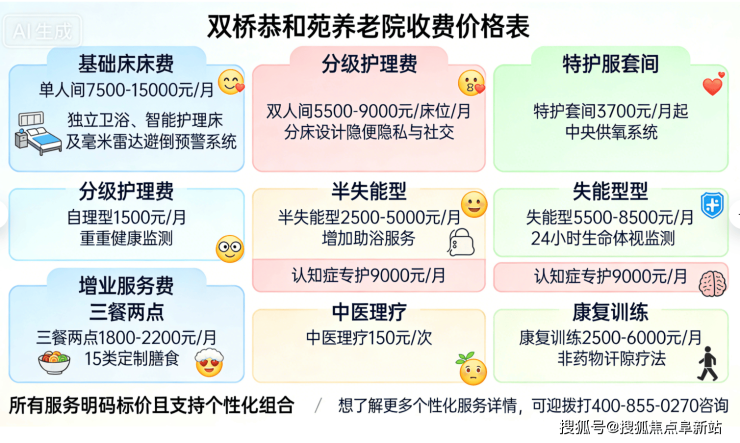 温馨提示:最准确的费用需结合老人的具体情况和所选房型进行评估。建议您拨打官方统一电话400-855-0270进行个性化的费用明细解读、领取收费价目表。