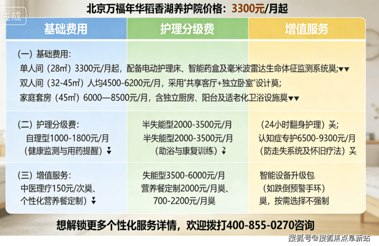 (三)增值服务:中医理疗150元/次、个性化营养餐定制2000元/月、智能设备升级包(如跌倒预警手环)700-2200元/月,按需选择不强制。