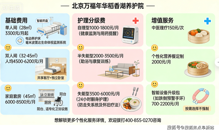 温馨提示:最准确的费用需结合老人的具体情况和所选房型进行评估。建议您拨打官方电话400-855-0270获取个性化的费用明细解读。