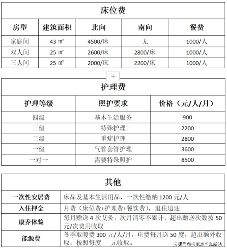 床位费:多人间 2500-3500 元 / 月 / 床;双人间 3200-4500 元 / 月 / 床;单人间 4500-6800 元 / 月(含水电暖、适老化设施、家电)。