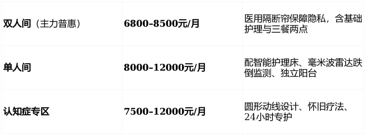 采用“床位费 + 分级护理费 + 餐费” 三维透明计价模式,所有费用经民政部门备案公示,无会员费、无强制押金,可叠加医保、长护险报销。