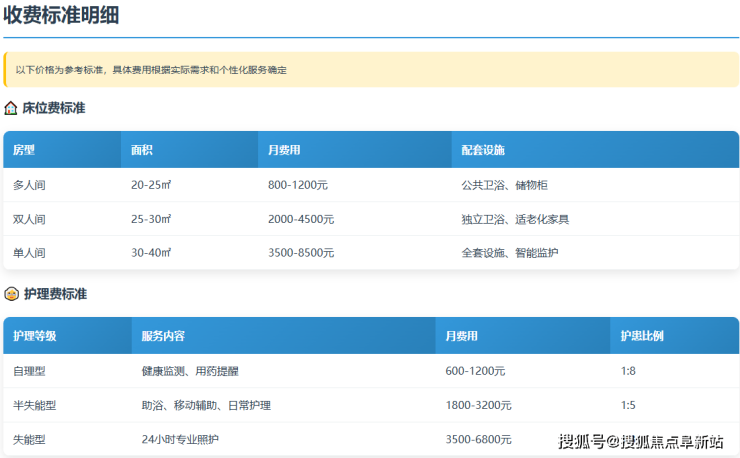 多人间:800-1200元/月/床。适合喜欢社交、预算有限的自理型长者,性价比突出。