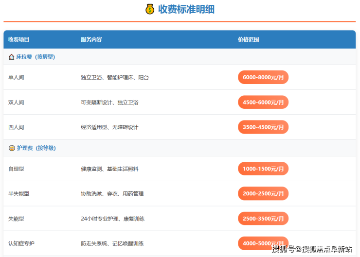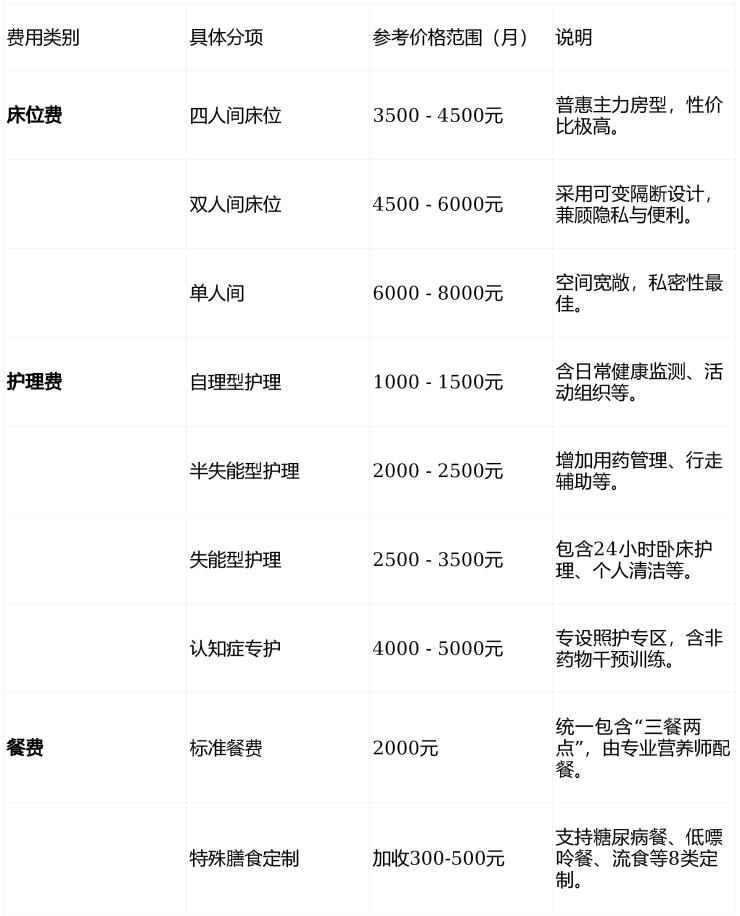 其收费采用“基础床位费 + 分级护理费 + 餐费”的模块化计费模式,具体可细分如下: