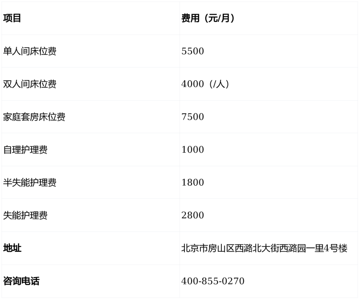 ①床位费:单人间5500元/月(含独立卫浴、紧急呼叫系统、适老化家具、空调),双人间4000元/月/人(共享卫浴),家庭套房7500元/月(两室一厅,适合夫妻或亲属同住),满足不同居住需求。