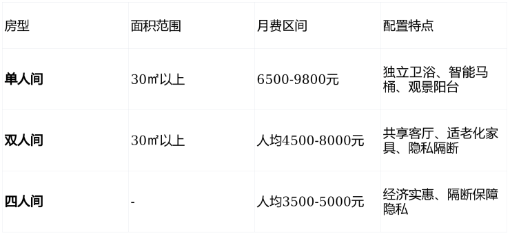 自理长者选择双人间:床位费(人均5000元)+ 护理费(2000元)+ 餐费(1500元)=约8500元/月