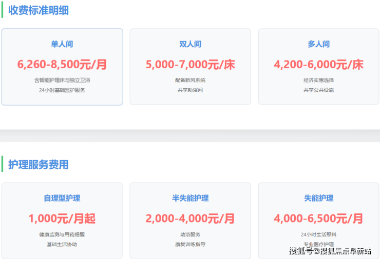 中高端档位:6260元/月起至18880元/月,包含单人间/套房住宿、个性化护理方案、专属健康监测等增值服务