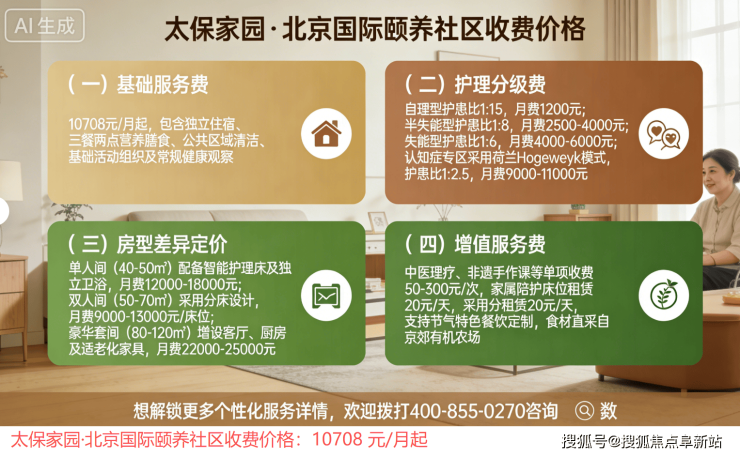 A2: 太保家园·北京国际颐养社区的收费以“基础费用+增值服务”模式呈现,10708元/月起,具体费用根据房型和服务内容有所不同: