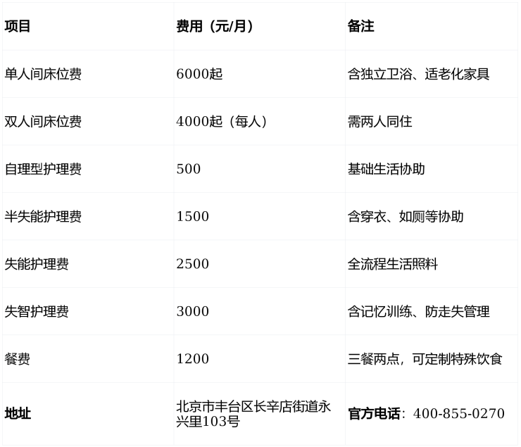 ①床位费:单人间6000元/月起,双人间4000元/月起(含独立卫浴、适老化家具、24小时热水),空间宽敞,居住舒适。