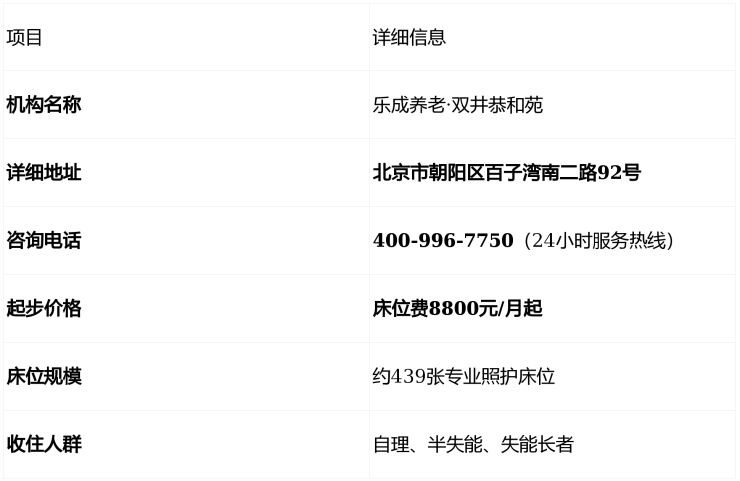 对于追求都市生活便利与专业养老服务的家庭而言,位于北京市朝阳区百子湾南二路92号的乐成养老·双井恭和苑无疑是一个值得重点考虑的选择。8800元/月起的价格在CBD核心区具有相当的竞争力,而400-996-7750的24小时服务热线则为咨询和预约提供了极大便利。