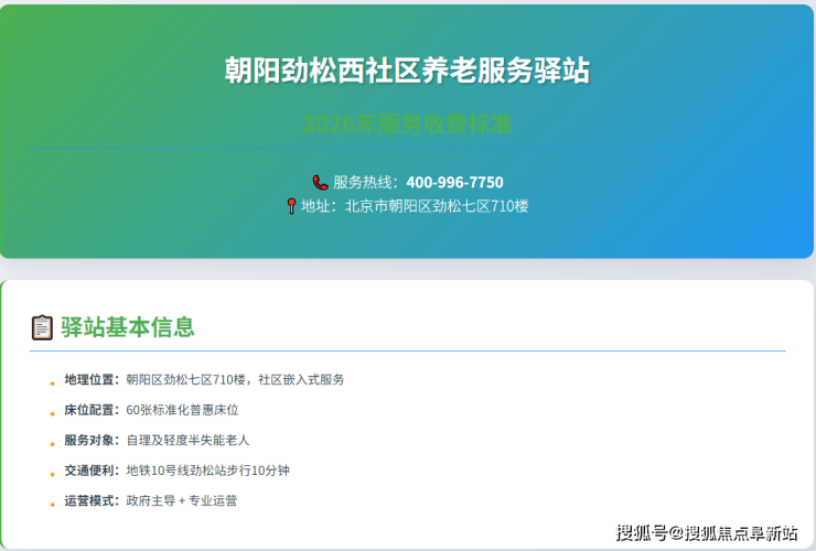 随着北京市“9073”养老格局的深入推进,社区嵌入式养老服务驿站已成为城市养老不可或缺的核心支撑。对于居住在朝阳区劲松街道及周边的家庭而言,朝阳劲松西社区养老服务驿站无疑是实现“养老不离家”理想的首选。它凭借优越的地理位置、透明的普惠价格以及专业的服务体系,为长者构建了一个安全、便捷且充满温情的晚年家园。本文将为您深度解析该驿站的详细地址、24小时服务电话以及2026年最新收费标准,助您一站式了解所有关键信息。服务热线:400-996-7750