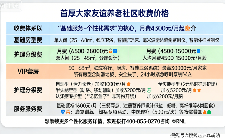 首厚大家友谊养老社区收费价格:4300元/月起,社区的收费体系以“基础服务+个性化需求”为核心,具体分为三大模块: