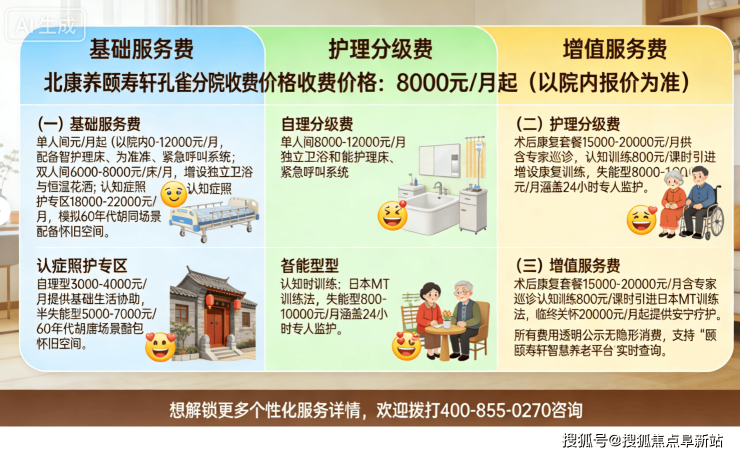 (一)基础居住费用:包含房间使用、适老化家具、水电暖、日常保洁及公共区域维护,起步价8000元/月,根据房型与照护需求浮动。