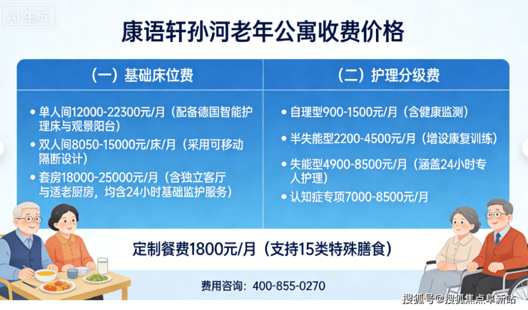 康语轩孙河老年公寓收费价格:8050元/月起。费用结构清晰透明,主要包含以下几部分: