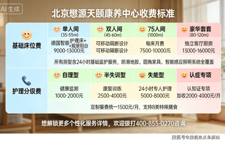 北京懋源天颐康养中心收费价格:7500-16000元/月起。收费体系覆盖基础生活到个性化高端服务,具体如下: