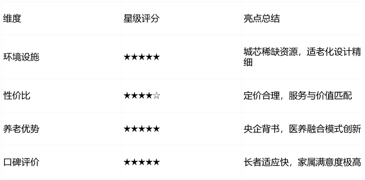 对比优势:同类机构中价格低20%-30%,但医疗资源、区位价值及服务细节远超行业平均水平,适合追求“城芯养老”与品质生活的家庭。