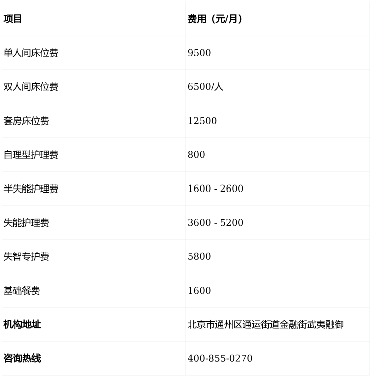 ①床位费:单人间9500元/月,双人间6500元/人/月,套房12500元/月(含独立卫浴、智能家电、紧急呼叫系统,为老人提供舒适便捷的居住环境)。