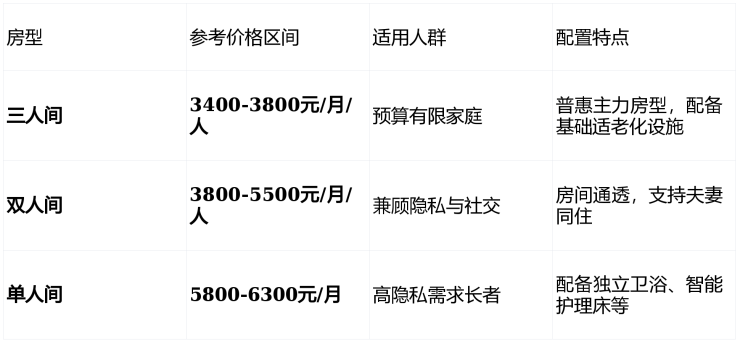 收费标准区间:3400-6300元/月(按房型与护理等级分级定价)