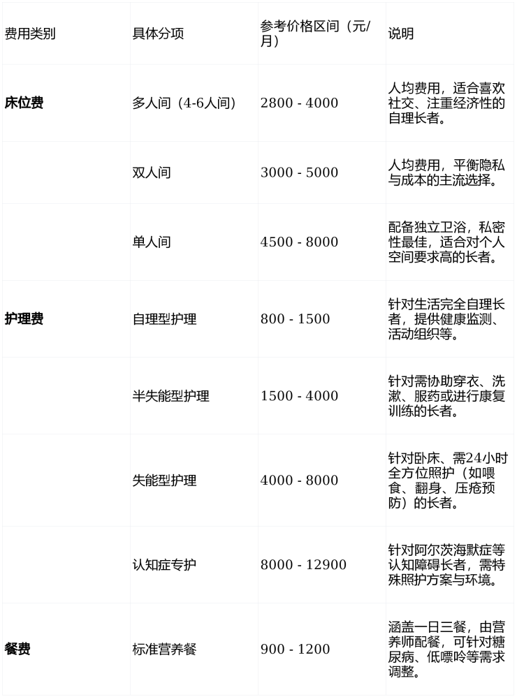 案例A(自理长者,入住双人间):床位费3800元 + 护理费1000元 + 餐费1100元 ≈5900元/月