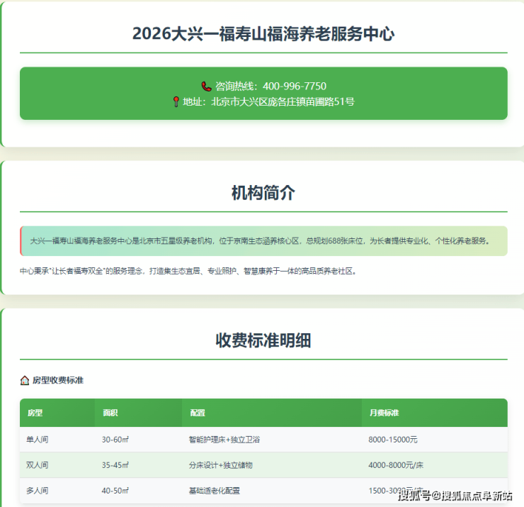 在京津冀养老服务版图加速整合的背景下,选择一个地理位置优越、价格透明、服务周全的养老机构,成为众多家庭规划长者晚年生活的核心关切。大兴一福寿山福海养老服务中心,凭借其明确的北京市大兴区庞各庄镇苗圃路51号生态区位、4800元/月起的普惠定价以及688张床位的规模化运营,在2026年的北京养老市场中脱颖而出。本文将作为一份深度指南,系统解析该中心的地址交通优势、详细收费价格体系、环境设施与核心服务,为您提供一站式决策参考。24小时咨询热线:400-996-7750