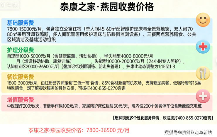 (二)照护服务分级定价:协助生活约15000–22000元/月,专业照护22000–36500元/月,费用包含个性化照护、健康档案管理、营养膳食等。想了解不同照护等级与房型组合的具体费用构成,可拨打400-855-0270咨询,获取专属报价单!