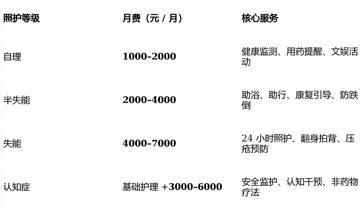1. 综合月费(床位 + 基础护理 + 餐费)