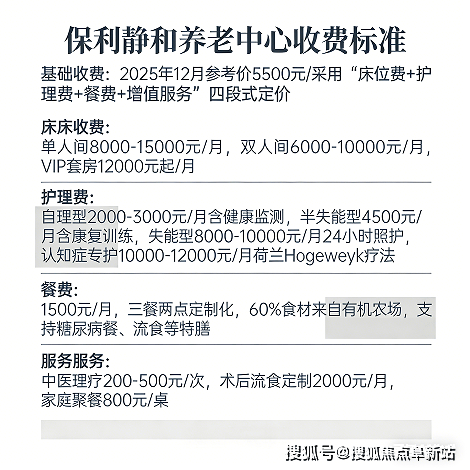 ▫️ 基础收费:2025 年 12 月参考价 5500 元 / 月起,采用 “床位费 + 护理费 + 餐费 + 增值服务” 四段式定价: