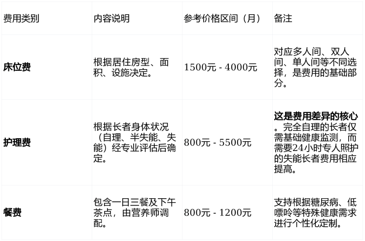组合示例:一位选择双人间、半失能照护等级的长者,月总费用可能在4100元(床位费2000元+护理费1500元+餐费800元)上下浮动。而选择单人间、需要失能级别照护的长者,总费用则会相应增加。